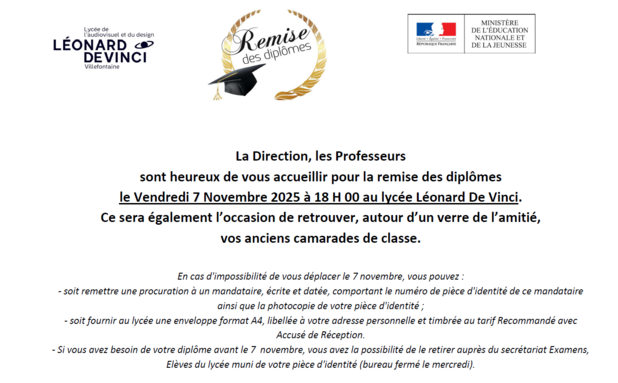 Par admin leonard-de-vinci, publié le mardi 21 octobre 2025 08:29 - Mis à jour le mardi 21 octobre 2025 08:31la remise des diplômes se déroulera le Vendredi 7 Novembre 2025 à 18 H 00 au lycée Léonard De Vinci -