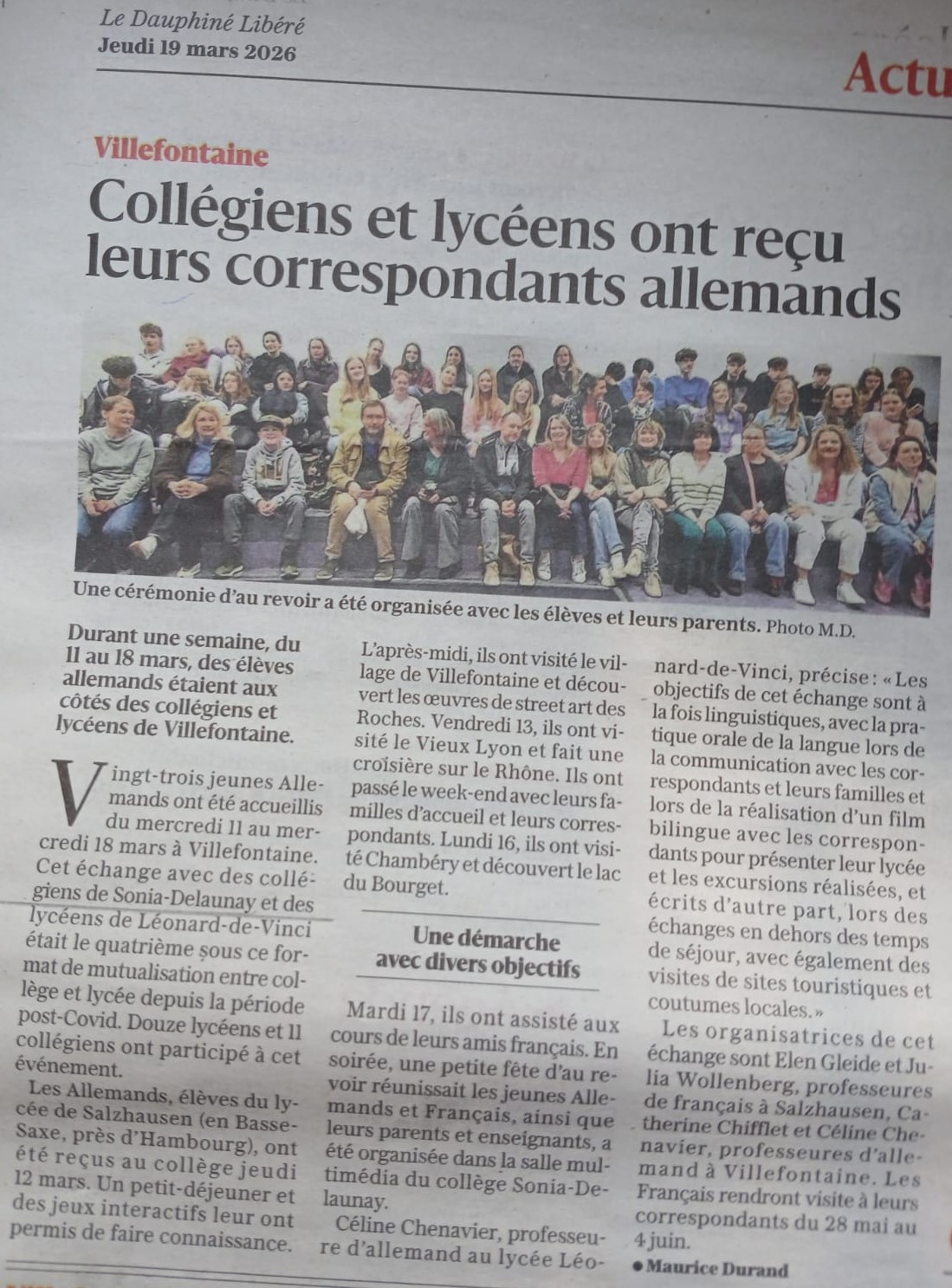 Pour la quatrième année consécutive, les élèves de secondes du lycée Léonard de Vinci ainsi que les élèves de troisième du CLG Delaunay ont accueilli du 11 au 18 mars dernier leurs correspondants allemands de Basse-Saxe( non loin de Hambourg). Toutes et tous ont hâte de se retrouver à Salzhausen pour la seconde partie de l'échange du 28 mai au 4 juin prochain.