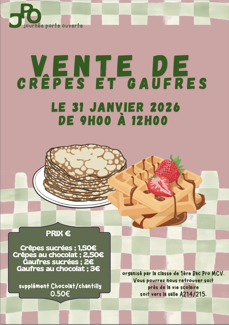 Venez soutenir le projet de la classe 1ère BAC Pro MCV lors de la JPO en achetant crêpes et gaufres sucrées !