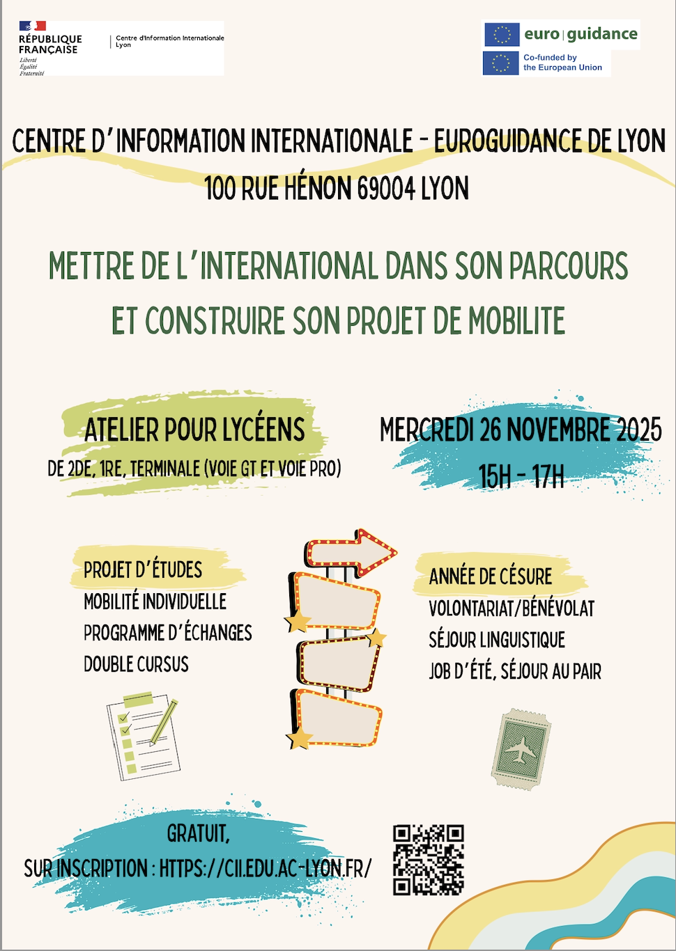 - en présentiel le mercredi 26 novembre de 15h à 17h au CII-Euroguidance: INSCRIPTION OBLIGATOIRE sur https://cii.edu.ac-lyon.fr/spip/