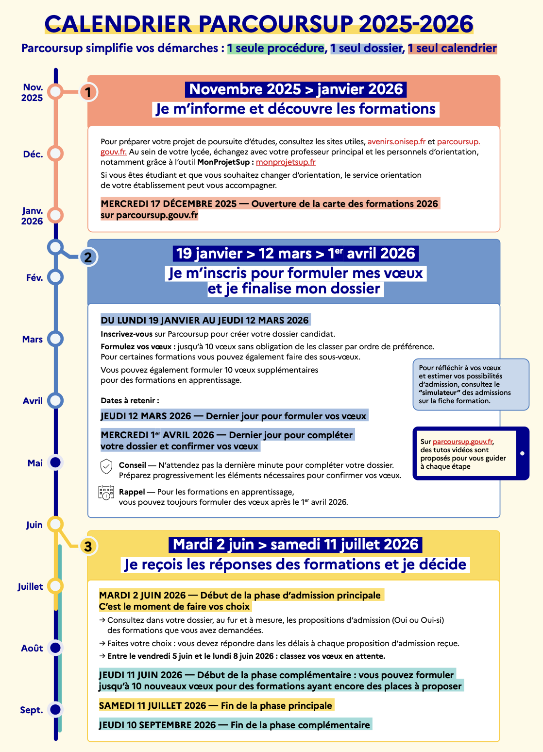 L’inscription et la formulation des vœux se dérouleront du lundi 19 janvier au jeudi 12 mars 2026. Les lycéens auront jusqu’au mercredi 1er avril pour compléter leur dossier et confirmer leurs vœux.